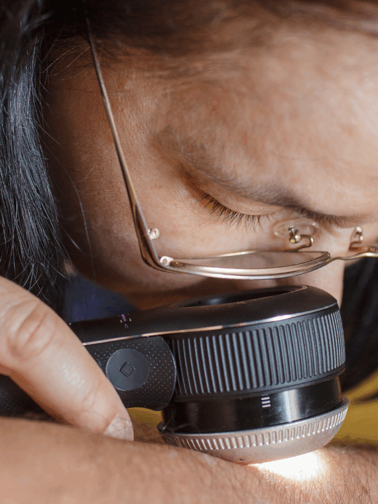A dermatoscopia é uma técnica não invasiva que utiliza o dermatoscópio para visualizar, de forma ampliada, estruturas dermatoscópicas presentes em tumores e doenças de pele. Ao permitir enxergar detalhes que não são vistos a olho nu, o exame favorece a identificação de alterações iniciais. Isso possibilita diagnóstico e tratamento precoces do câncer de pele, assim como de outras condições dermatológicas, contribuindo para condutas mais assertivas e seguras no acompanhamento clínico.